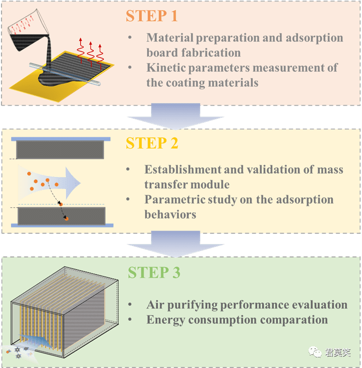 室内气态污染物(VOCs)主要由建材、涂料、家具等散发,其低浓度、多组分和长期缓慢释放的特性对人体健康造成了持续的慢性危害。吸附净化是去除VOCs主要的方法,然而现有吸附净化模块寿命有限,吸附容量较低。我们前期研究中提出了一种原位热再生的薄层吸附模块(https://doi.org/10.1111/ina.12540),可以有效拓展吸附材料使用寿命,并显著降低风阻。但是对于该吸附模块在实际应用中的材料选取,尺寸设计以及能耗分析尚缺乏充分研究,限制了该净化模块在实际环境中的应用推广。