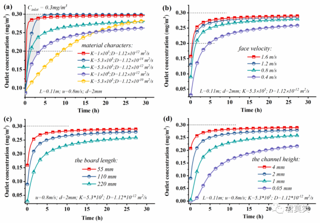 利用上述建立的模型,可分析不同材料、几何参数以及运行工况下,吸附薄层模块对甲醛的吸附、脱附过程的性能(如图3所示)。模型计算表明:扩散系数D在吸附过程中具有重要影响。相比增大材料的平衡吸附量,适当的增加扩散系数D可实现更长的穿透时间和更大的有效吸附容量(一定工作时间内的容量)。所建立的模型可针对实际净化需求,对吸附薄层模块的材料选取、几何参数和运行工况进行优化设计。