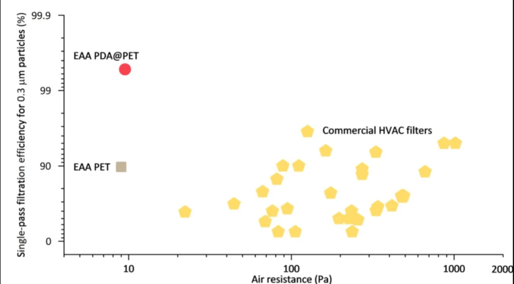 1)本研究通过原位多巴胺聚合工艺将聚多巴胺(PDA)负载在粗效PET纤维上,通过与双荷电静电增强过滤装置(EAA)结合,与市售暖通空调用过滤器相比,实现了高过滤效率和低阻力的优异性能:对0.3 μm颗粒物实现高达99.48%的过滤效率,并且在迎面风速为0.4 m/s时空气阻力低至9.5 Pa。由于其具备低阻、高效特性,可直接加装应用于送风口或通风管道,而无需增设驱动风机。