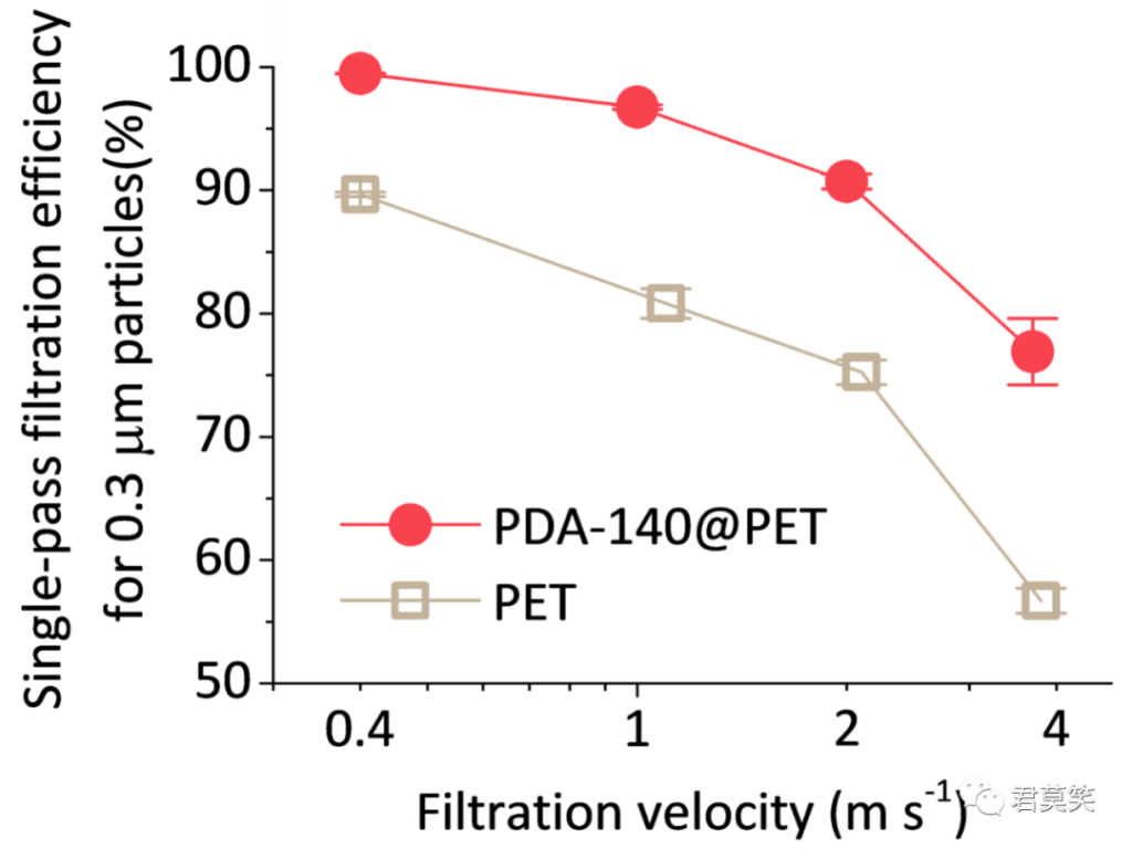 EAA PDA@PET过滤器可以对0.3 μm颗粒物实现高达99.48%的过滤效率,并且在滤速为0.4 m/s时空气阻力低至9.5 Pa。与不负载PDA的普通市售PET过滤材料对比,过滤效率显著提升的同时,阻力无明显变化。