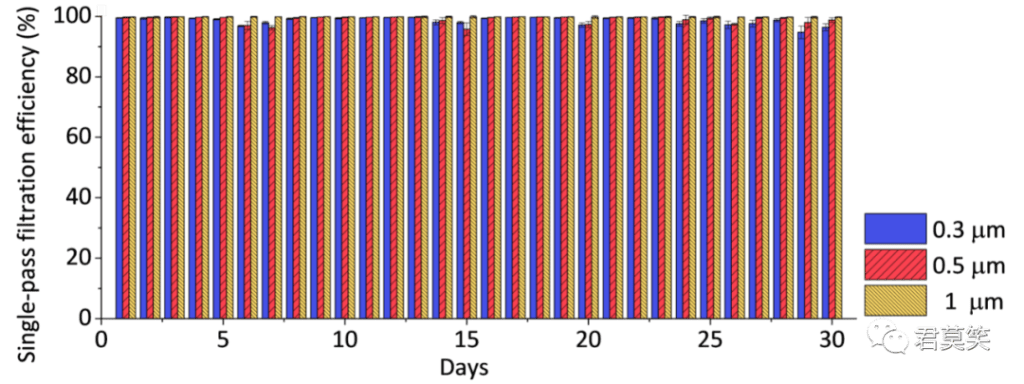 该EAA PDA-140@PET过滤装置在长达30天,每天运行8小时的长期工况中表现出稳定的高过滤效率(如下图,对0.3、0.5和1 μm颗粒物的平均过滤效率分别为 98.63%、99.04% 和 99.83%)。