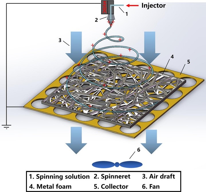 本研究的思路是通过PVDF纳米纤维与静电增强泡沫金属过滤相结合,以期在保留阻燃和低阻特性的基础上进一步提升过滤性能。如图1所示,使用气流辅助式静电纺丝的方式将PVDF纳米纤维快速深入地负载在泡沫金属过滤材料内部。