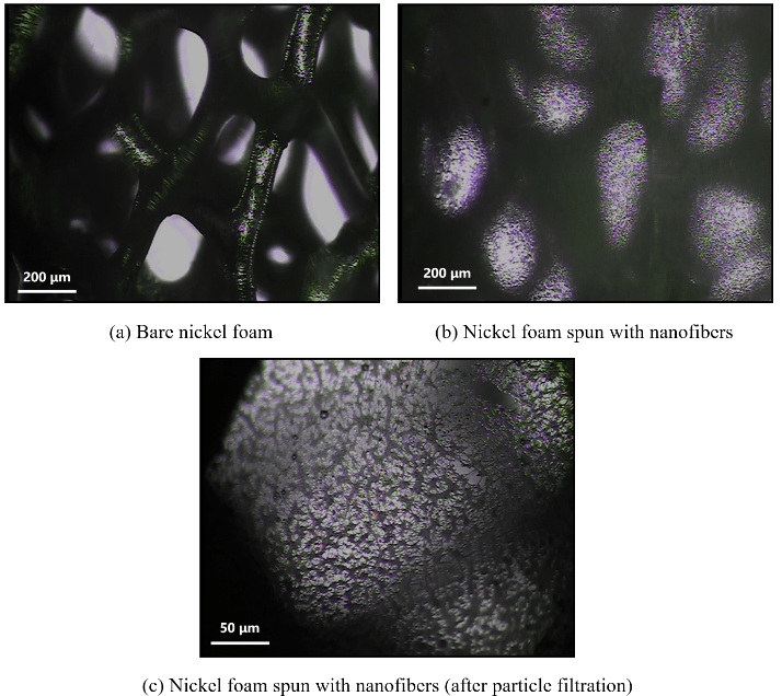 图2. 光学显微镜拍摄:在泡沫金属骨架间的PVDF纳米纤维
