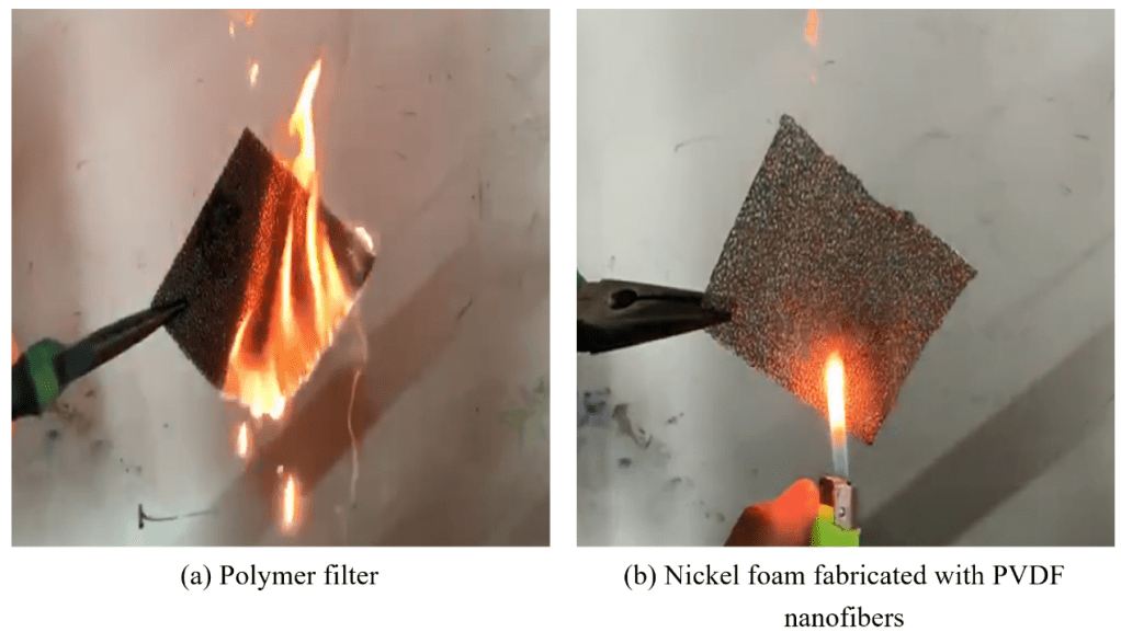 图5和视频:纳米纤维-泡沫金属和普通纤维材料的燃烧性能对比