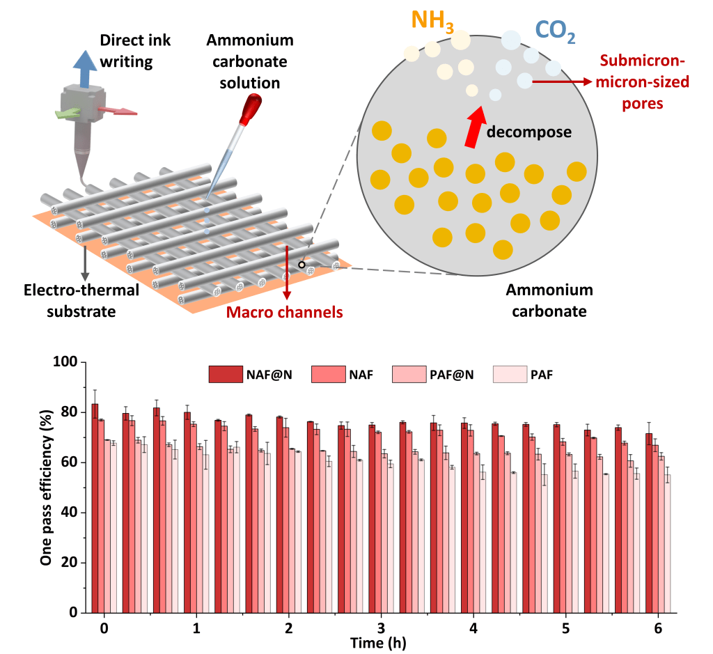 室内VOCs对人体健康的慢性长期威胁依然不可忽略。吸附技术由于其低成本和对广谱VOCs具有有效的去除作用,普遍适用于通风受限的建筑环境中。直接墨水书写(DIW)制备的便捷性、灵活性和鲁棒性使其在吸附材料的制备和吸附技术的研究应用中广受欢迎。但是DIW墨水流变特性的高要求对于吸附材料的选取有一定的限制,例如活性碳材料。另外DIW分辨率的限制使得其很难实现微纳尺度孔结构的实现。本研究使用活性碳和ZSM-5沸石结合改善墨水的流变特性,并开发了碳酸铵膨化法,结合DIW实现了毫微纳多尺度孔结构吸附薄层的制备。