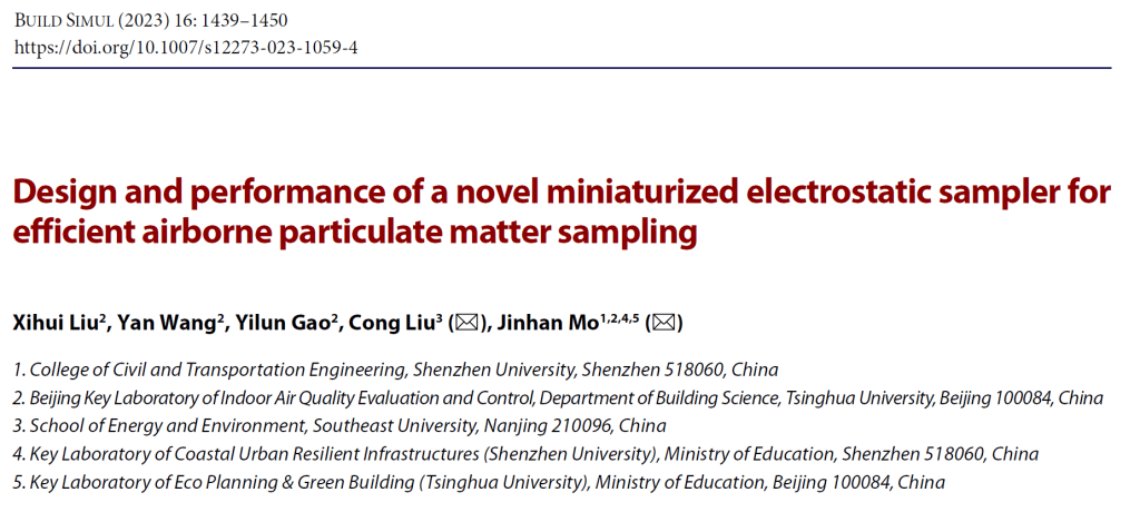 2023年7月18日,Building Simulation杂志(IF: 5.500)刊登了课题组刘锡慧博士生的论文:Design and performance of a novel miniaturized electrostatic sampler for efficient particulate matter sampling:一种新型的微型静电式颗粒物采样器 (https://doi.org/10.1007/s12273-023-1059-4)