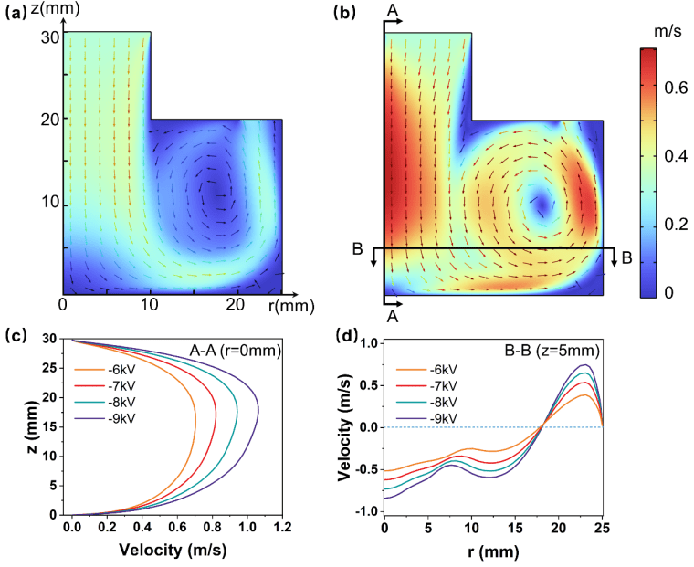 放电电晕发生后(图3b),与无放电时相比(图3a),中心的气流速度明显增大,形成离子风,最大速度从0.38m/s增大至0.7m/s。