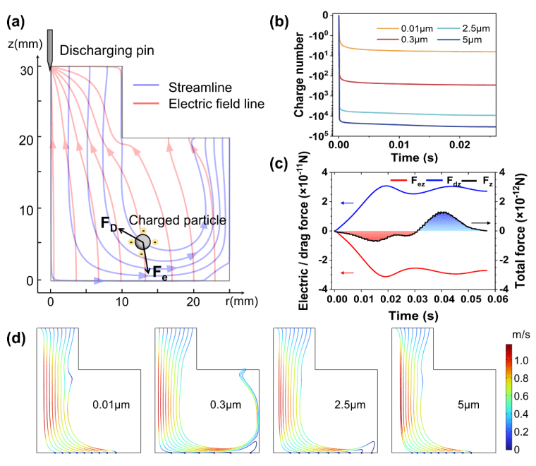 考虑颗粒物所受的曳力和电场力,颗粒物首先在电场力的主导向下加速,然后在曳力主导下减速,最后沉积在收集板上。大部分颗粒物被采集,部分0.3μm颗粒物逃逸。
