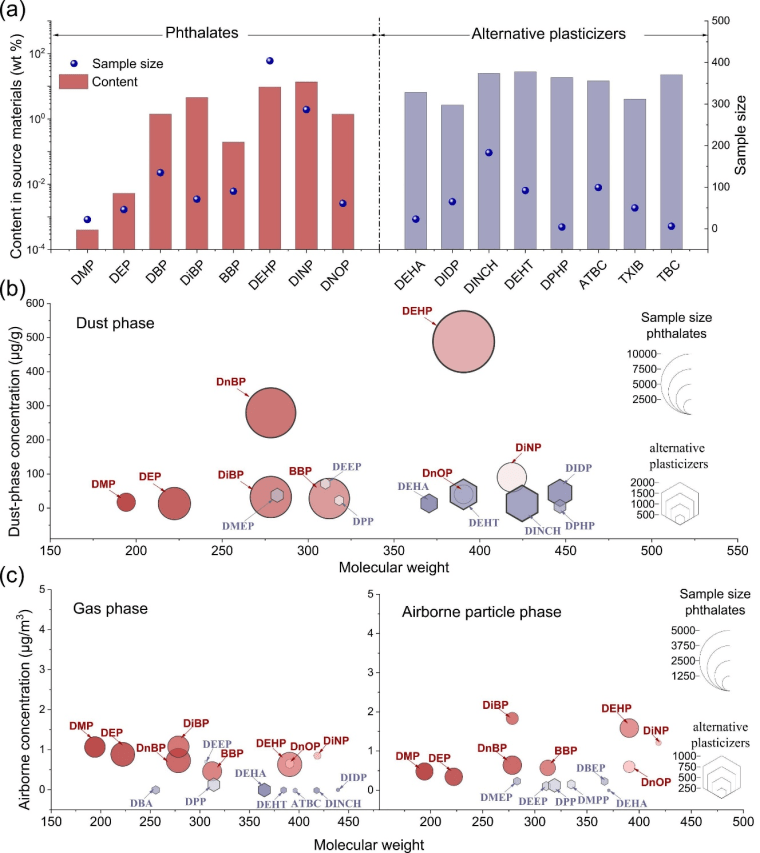 增塑剂包括传统的邻苯二甲酸酯(phthalates,下文简称PAEs)及其新兴替代品(alternative plasticizers,下文简称APs),因其在室内环境中的广泛存在及对空气质量的污染而引起了广泛关注。增塑剂种类繁多且相关工业产品发展迅速,这导致研究人员难以确定PAEs和APs的实际室内分布。更重要的是,新兴APs的实际室内浓度甚至比传统PAEs更难总结,使得研究者对这些污染物的暴露评估和控制难以推进。