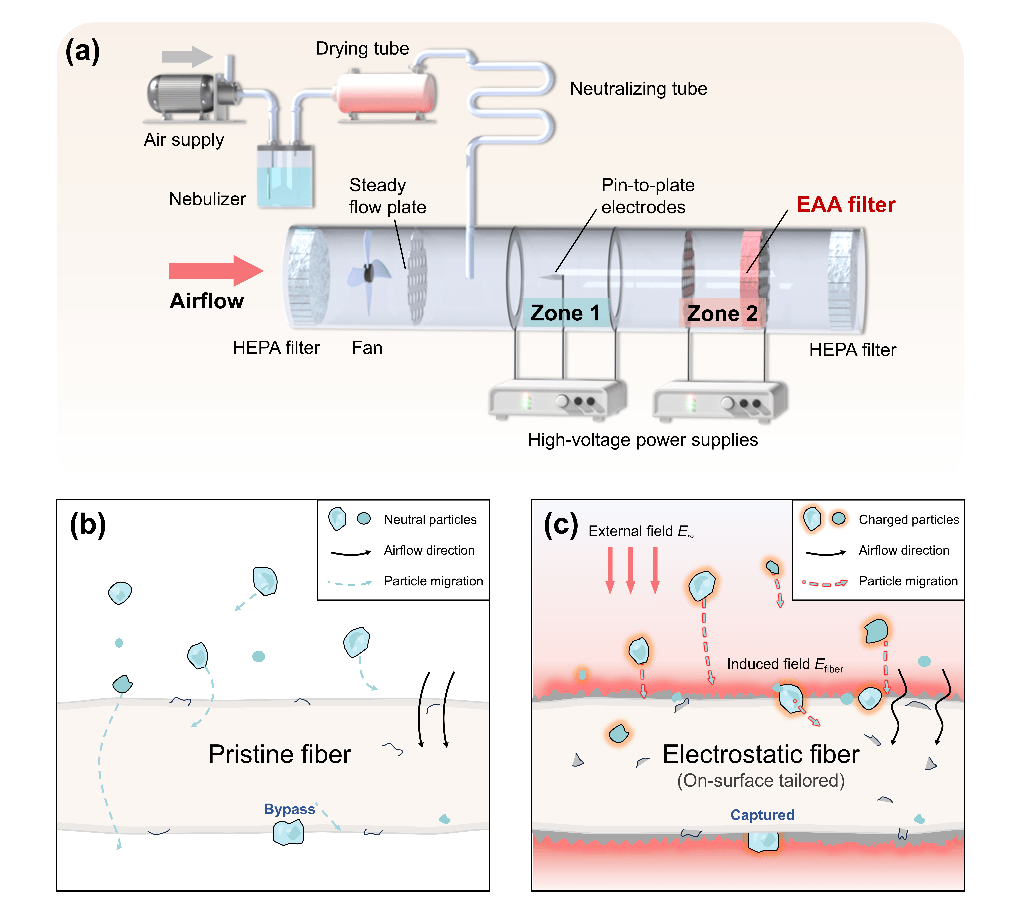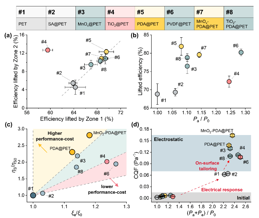 提出了以提升纤维表面粗糙度与静电势为目标的界面修饰策略以提升过滤性能,应用该策略,在极化电场下,介电纤维表面形成局部感应电场可驱动颗粒物加速运动,实现效率提升;此外,仅改变纤维的表面性质而不破坏其蓬松结构,可以维持粗效基材的阻力特性(如图1)。