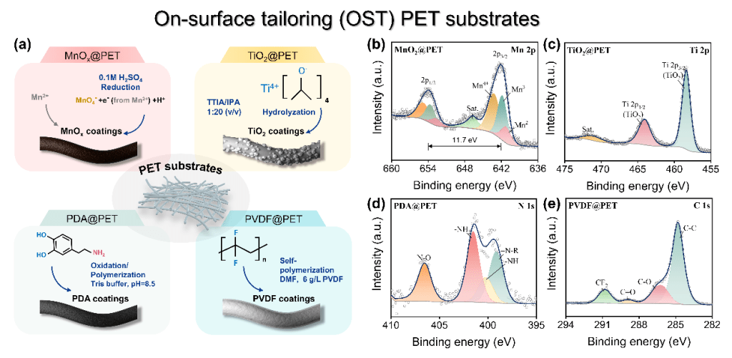 以聚酯PET纤维为基材,通过液相反应,制备了7种形貌各异的复合纤维(下称“系列纤维”),分别为:酸蚀PET,氧化锰、氧化钛、聚多巴胺、聚偏二氯乙烯、氧化锰-聚多巴胺、氧化钛-聚多巴胺负载PET,液相合成无基材选择性。利用SEM-EDS、XPS、XRD、TGA等定量、半定量表征手段研究了表面负载的物理化学性质(如图2、3)。