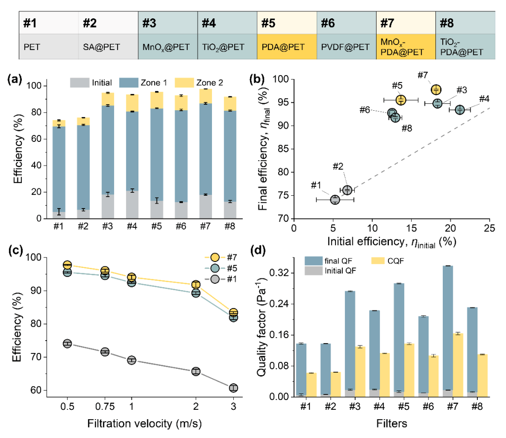 如何克服纤维过滤器效率、阻力、容尘量的本构限制关系是空气过滤的核心难题。本工作介绍了一种电场激励下的界面修饰(e-OST)策略,分析了荷电颗粒物在单根极化纤维表面的传递规律与静电力参数;成功制备了一系列表面负载的聚酯纤维过滤器(x@PET);建立了评价该修饰策略收益-代价的通用无量纲参数。通过颗粒物荷电-纤维极化电场激励,同时提升纤维表面粗糙度与静电势,实现了高效、低阻、长期性能良好的颗粒物过滤,在表面修饰涂层厚度仅为纤维间距千分之一的情况下,可实现纤维过滤品质因子50倍以上的提升。