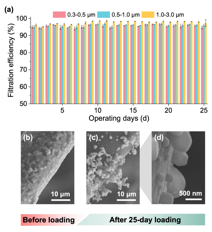 采用原子力显微镜KPFM模式对优选纤维表面进行表征,确定其表面粘附性质与静电势与基材相比均有大幅提升(如图6)。对优选的MnOx-PDA@PET进行长期性能测试,其25天0.3–0.5 μm氯化钠颗粒物平均过滤效率达95.6%,扫描电镜观测到表面颗粒物粘附形貌,体现了纤维修饰表面良好的持尘能力(如图7)。