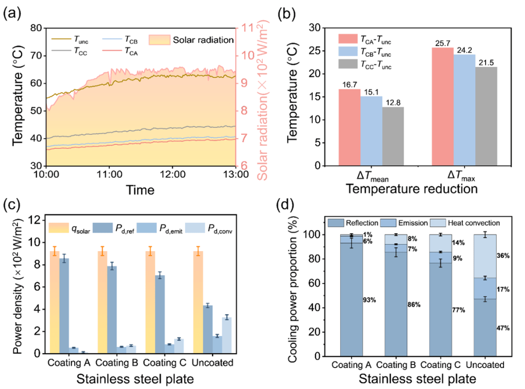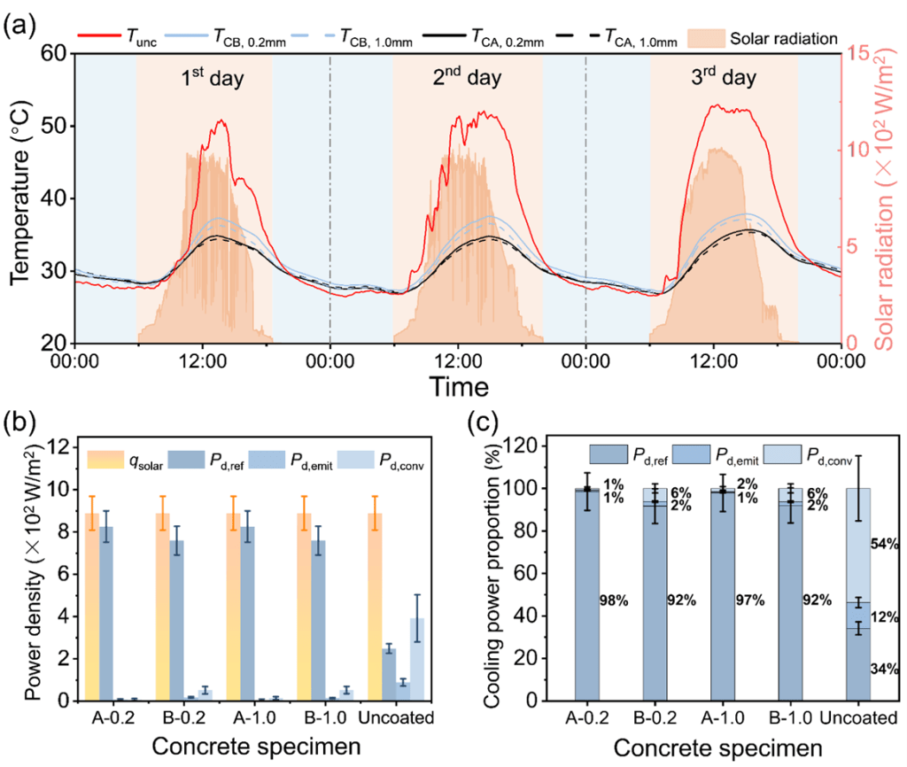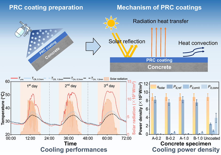 本研究首先在不锈钢板上进行了PRC涂层冷却性能的实验测定。与未涂覆冷却涂层的板材相比,PRC涂层能实现21.5-25.7°C的最大温降。通过理论计算发现,涂层对太阳辐射的反射过程是实现其良好冷却性能的主要因素,其冷却功率密度为706-857 W/m2,占总冷却功率密度的77%-93%(图3)。本文同时发现PRC冷却性能主要由材料性能决定,与涂层厚度的相关性较小。本研究进而将PRC涂层应用于C55混凝土试件进行实际冷却效果测定。结果发现,PRC涂层使试件的表面温度平均降低了16°C,与未涂覆冷却涂层的试件相比降低了38%(图4)。试件的内部温度梯度则降低了47°C/m,相当于67%的降幅。
