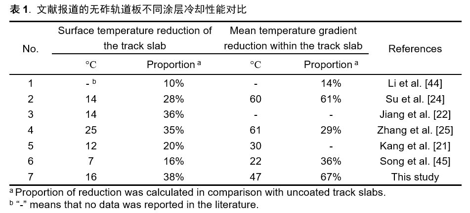 与文献相比,本研究所应用的PRC涂层不仅对太阳辐射表现出高反射率,而且在红外波长范围内也表现出高发射率,从而为轨道板试件带来了优异的冷却性能。在自然太阳辐射下,PRC涂层使试件的表面温度和内部温度梯度分别降低了约38%和67%,在现有文献报道的数据中居于首位。通过对涂层材料和制备工艺的优化,PRC涂层的冷却性能有望进一步提升。