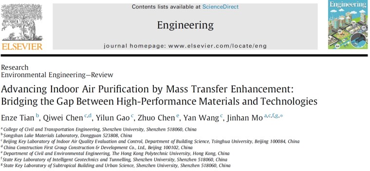 Tian EZ, Chen QW, Gao YL, Chen Z, Wang Y, Mo JH*. Advancing indoor air purification by mass transfer enhancement: Bridging the gap between high-performance materials and technologies, Engineering, 2025. https://doi.org/10.1016/j.eng.2025.07.003
