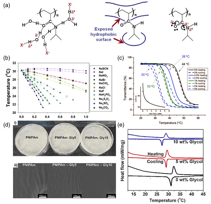 如图1所示,论文首先回顾了过去十年间水凝胶基热致变色窗的研究进展。自从2014年水凝胶基智能窗被报道以来,水凝胶基热致变色窗逐渐朝着光学性能强化、太阳能多功能利用以及多刺激响应等优化方向不断演变,逐渐发展为具有高太阳能调制率、高响应速度、宽响应范围的多功能智能窗。此外,围绕热致变色窗的多项性能指标,系统综述了包括下临界溶解温度(LCST)调控(图2)、机械性能强化、响应速率提升、光学性能提升以及多功能性演变(图3)在内的调控机理和研究进展。