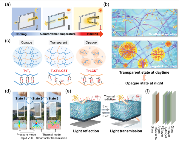响应型水凝胶在温度、光照、电场等外界刺激下能够发生可逆相变并伴随着透明度变化,具有优异的光学调控性,是作为智能变色窗的理想材料之一。根据不同的响应机制,水凝胶基智能窗主要可以分为热致变色(TC)和电致变色(EC)两种。热致变色窗可以根据温度波动智能调节其光学特性和室内太阳得热量。同理,电致变色窗可以通过施加外部电压来实现可见光和太阳辐射的主动管理。