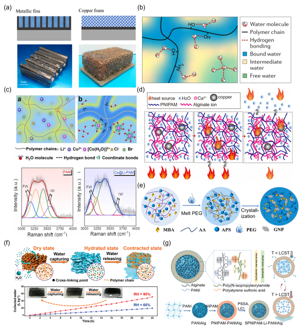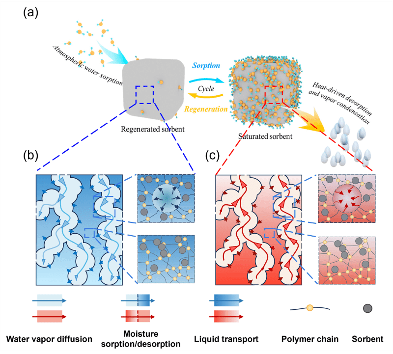吸湿水凝胶的性能取决于其热质传递过程。与常规吸附剂相比,吸湿水凝胶具有更高的吸水能力,相对较低的解吸温度和较宽的湿度响应性。然而,受限于有限的界面传质面积,较高的内部扩散阻力,以及缓慢的内部热传递过程,需要进一步优化吸湿水凝胶的传热传质过程,以提高其吸附和解吸动力学特性。