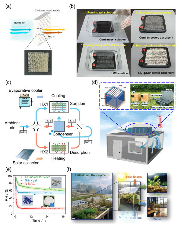 根据上述工作原理,吸湿水凝胶可用于室内除湿以及建筑表面热管理。通过将吸湿水凝胶涂覆在包括除湿转轮、换热器等结构表面,或者集成为吸附模块,可以实现受限空间内快速、高效除湿(图6)。对于吸附的水,可以进一步经过脱附、捕获、富集等过程以提供生产、生活用水。而对于吸湿水凝胶的再生过程,得益于液-气相变的高蒸发潜热,使得水凝胶成为具有前景的被动蒸发冷却材料。夜晚,吸湿水凝胶从环境中吸附水蒸气并储存。白天,在太阳辐射的作用下,水凝胶实现再生,同时带走建筑表面余热,实现有效的建筑围护结构热管理(图7)。
