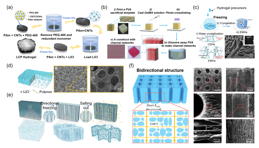 对于吸附动力学特性,关键在于优化水蒸气在水凝胶内部的扩散、吸附和输运过程。对于水蒸气扩散,其遵循菲克扩散定律,主要受有效扩散系数(Deff)和水蒸气浓度差影响。特别地,Deff 参数受多孔介质的孔隙率ε和曲折度τ影响,提高孔隙率并降低曲折度有利于提高水蒸气扩散速率(图8)。对此,文章总结了包括使用孔隙发泡剂、聚合抑制剂、水溶性模板以及冻融法等方法以增大多孔介质孔径,显著地改善了水蒸气扩散性能。这些方法虽然提高了孔隙率,但孔道的方向不可控,无法建立连续、定向的孔道结构以降低曲折度。冷冻铸造(又称“冰模板法”)是一种制备有序多孔材料的技术,其基本原理是通过构建定向温度梯度以冷冻混合溶液或浆料,使得冰晶在冷冻表面上成核,并沿着温度梯度定向生长,经过冷冻干燥后,最终得到有序的、具有定向孔道的结构。