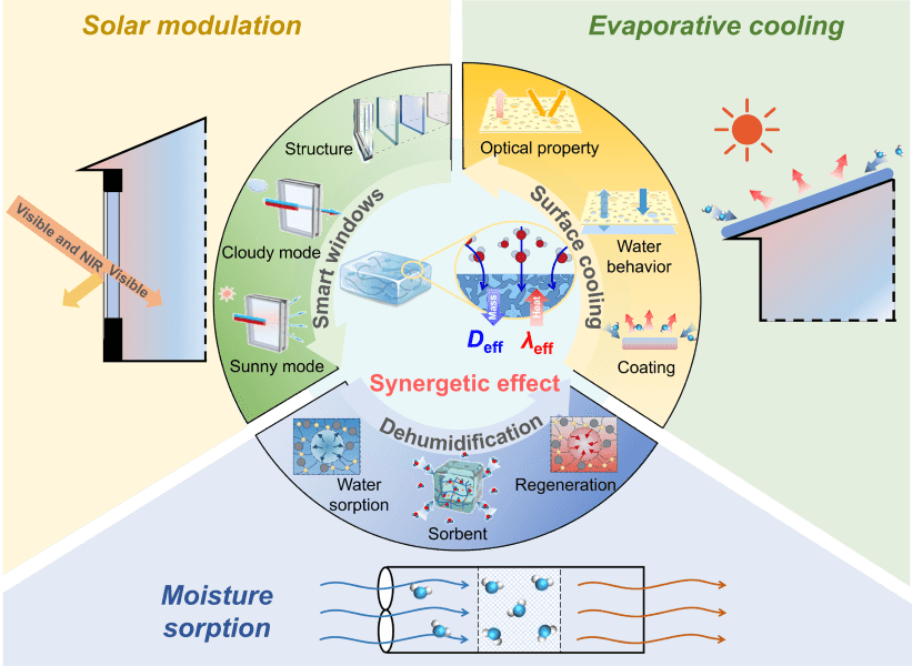 在本研究中,我们系统地回顾了新型水凝胶材料在建筑围护结构以及建筑环境中的应用,包括智能窗户系统、室内湿度控制以及建筑表面热管理。此外,我们还探讨了强化吸湿水凝胶内部热质传递过程的基本原理及优化方法,以提高其吸附和解吸动力学特性,实现快速、高效、低成本的吸湿及再生。最后,我们对目前水凝胶材料仍然面临的挑战以及未来水凝胶基复合材料的设计提供了深入的见解。
