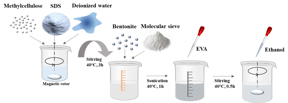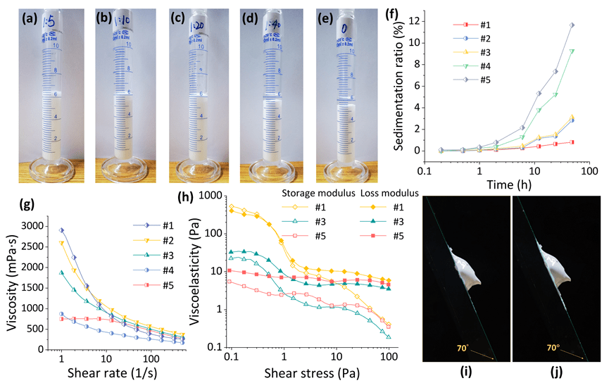 本研究通过3D打印方法设计制备具有不同界面形貌的吸附薄层。选取3A分子筛作为吸附材料,去离子水作为溶剂,通过添加一定比例的粘结剂,增塑剂和表面活性剂调配打印墨水(如图1)。调节表面活性剂的比例,得到5种打印墨水,分别进行沉降实验和流变特性的测试(如图2)。结果表明,含有20%表面活性剂的打印墨水分散稳定,48小时后沉降率小于1%。流变特性的测试结果表明,打印墨水具有剪切稀释的非牛顿流体特性。在打印过程中,高剪切速率下墨水的粘度低,呈现出液态物质的特性,因此墨水打印流畅连续;完成打印后,剪切速率降低,粘度提升,墨水呈现出固态物质的特性,因此不发生形变。取少量的打印墨水置于与水平面成70°角的亚克力板上,放置2小时,未出现明显流动形变。上述结果表明表面活性剂优化了墨水的流变特性,使得墨水呈现出剪切稀释的特性,适用于液体3D打印。