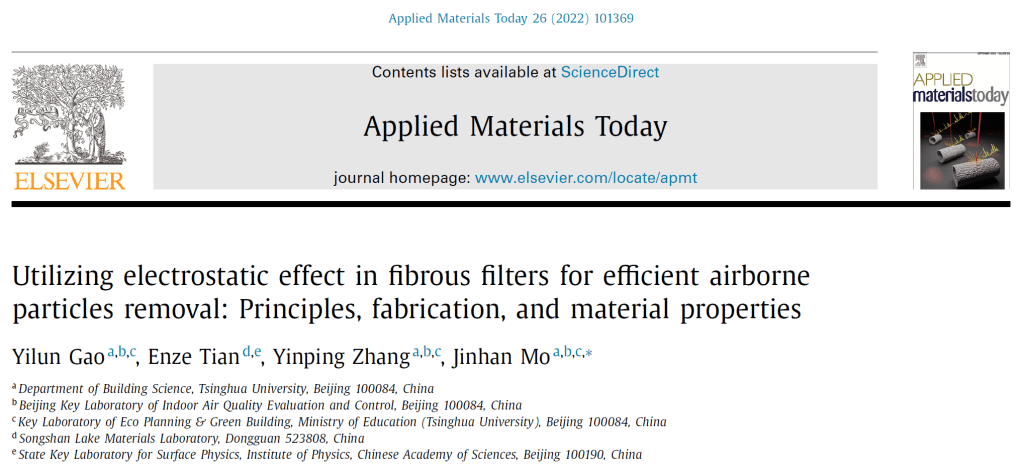 Gao YL, Tian EZ, Zhang YP, Mo JH*, Utilizing electrostatic effect in fibrous air filters for efficient airborne particles removal: Principles, fabrication, and material properties, Applied Materials Today (IF: 10.041), 2022, 26, 101369.