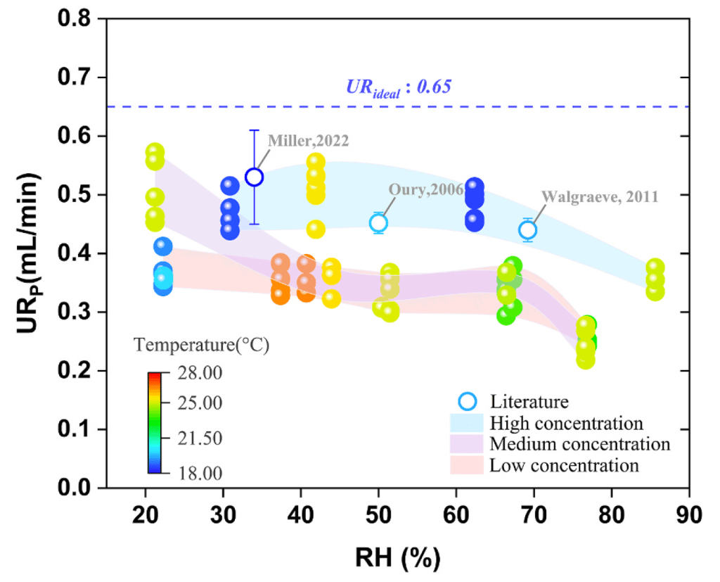采用Pearson和Spearman相关性分析方法,揭示了RH、温度对URp的负影响和浓度对被动采样速率的正影响具有统计学意义(p<0.05)。在本研究实验工况下,增大温度和湿度,可使甲苯被动采样速率最大降低25.9%和46.2%,而浓度升高则显著增大甲苯采样速率,最大可提高45.2%。