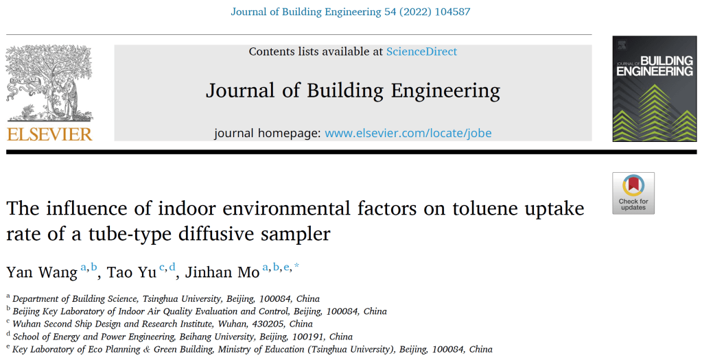 Wang Y, Yu T, Mo JH*, The influence of indoor environmental factors on toluene uptake rate of a tube-type diffusive sampler, Journal of Building Engineering (IF: 5.318), 2022, 104587.