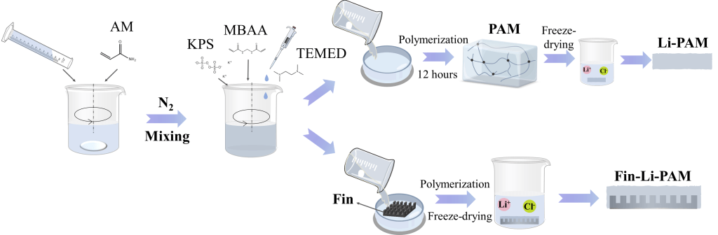 图1展示了氯化锂-聚丙烯酰胺(Li-PAM)吸湿水凝胶和肋片-氯化锂-聚丙烯酰胺(Fin-Li-PAM)复合结构的制备方法。水凝胶通过原位自由基聚合的方法进行制备(其中丙烯酰胺(AM)作为聚合单体,过硫酸钾(KPS)作为引发剂,N,N’-亚甲基双丙烯酰胺(MBAA)作为交联剂,四甲基乙二胺(TEMED)作为催化剂)。