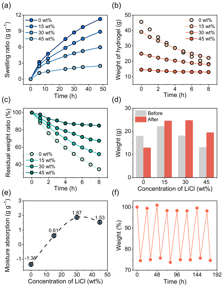 研究了Li-PAM水凝胶的吸附动力学。通过对比不同浓度的Li-PAM水凝胶,分析LiCl负载量对于水凝胶溶胀、吸附和脱附性能的影响,并得到LiCl溶液的最优浓度。如图3所示,由于盐析效应,PAM水凝胶的溶胀率随着LiCl浓度的增加而下降,而其保水能力相应提升。Li-PAM的吸湿能力随着LiCl浓度的增加而上升,但过量的LiCl导致水凝胶溶胀率的下降,进而削弱了其吸湿能力。因此,30wt%的LiCl溶液被认为是PAM水凝胶负载LiCl的最优浓度。此外,经过7次脱附/吸附循环实验后,Li-PAM仍然表现出良好的脱附、吸附性能,具有良好的耐久性。